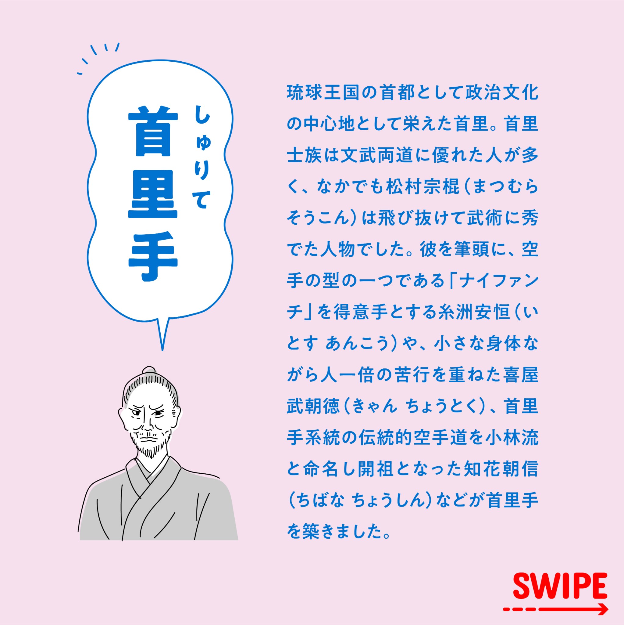 「那覇手」「首里手」「泊手」「上地流」と、ほとんどの流派(系統)に、沖縄の中で発展を遂げた地域の名前が、またその発展の影には、空手を愛し、伝えてきた偉大な空手家たちがいました。